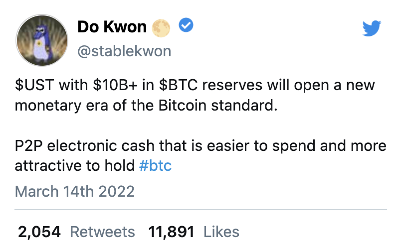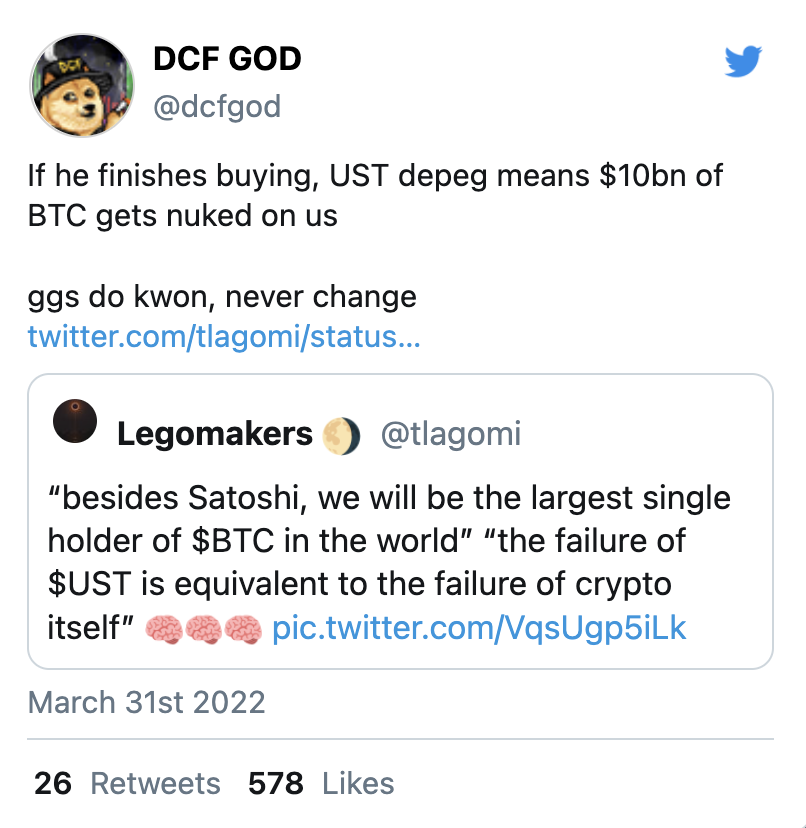 If too many people sell UST at once, it could force Terra to sell a big chunk of their $10 billion dollar Bitcoin reserve.